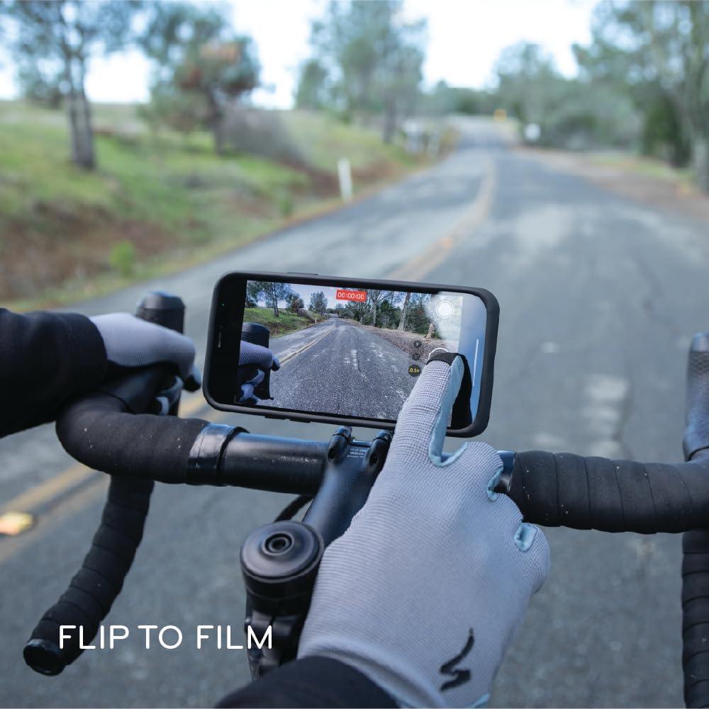 FULLY ADJUSTABLE AND ACCESSORY READY: The bike phone mount flips up for filming your ride or tucks below or behind your handlebars to make room for a bike computer. Includes accessory mount for attaching lights or action cams.