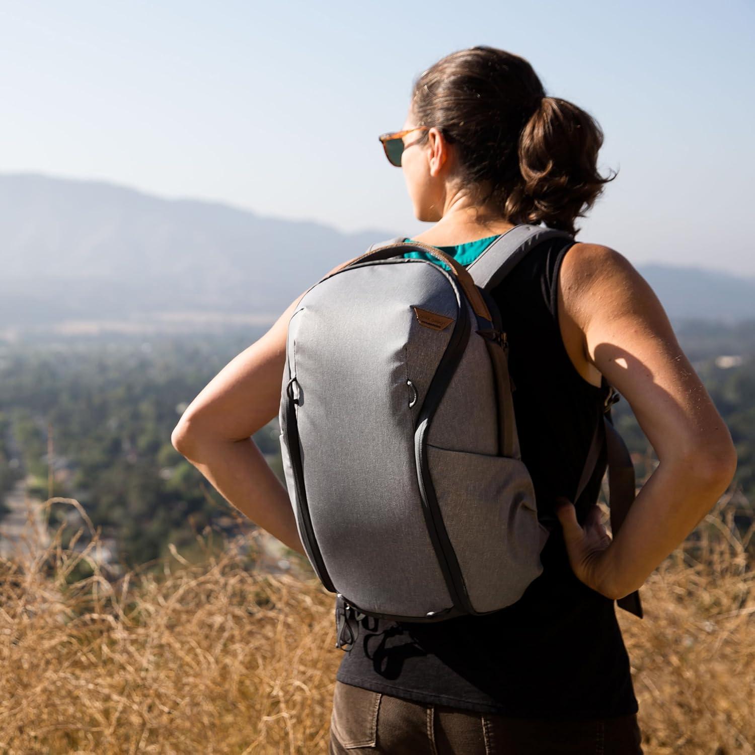 The Peak Design 15 L Everyday Backpack Zip comes with ample space to store your essentials while camping. Nylon and polyester fabric construction. Stretchy, waterproof internal side and top pockets for cards, cords, peripherals, three internal slip pockets for wallet, passport, and important items. Top and dual side access via a single 270-degree weatherproof zip.